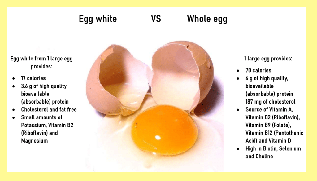 To help visualize the difference in nutrients, look at the comparison below. It’s obvious that the egg white is low in calories due to the fat free content and it’s a good source of protein, but it doesn’t provide many vitamins or minerals. On the other hand, a whole egg provides more calories (nearly 4x more than the egg white alone) and it has a substantial amount of cholesterol, but it has many more vitamins and minerals.