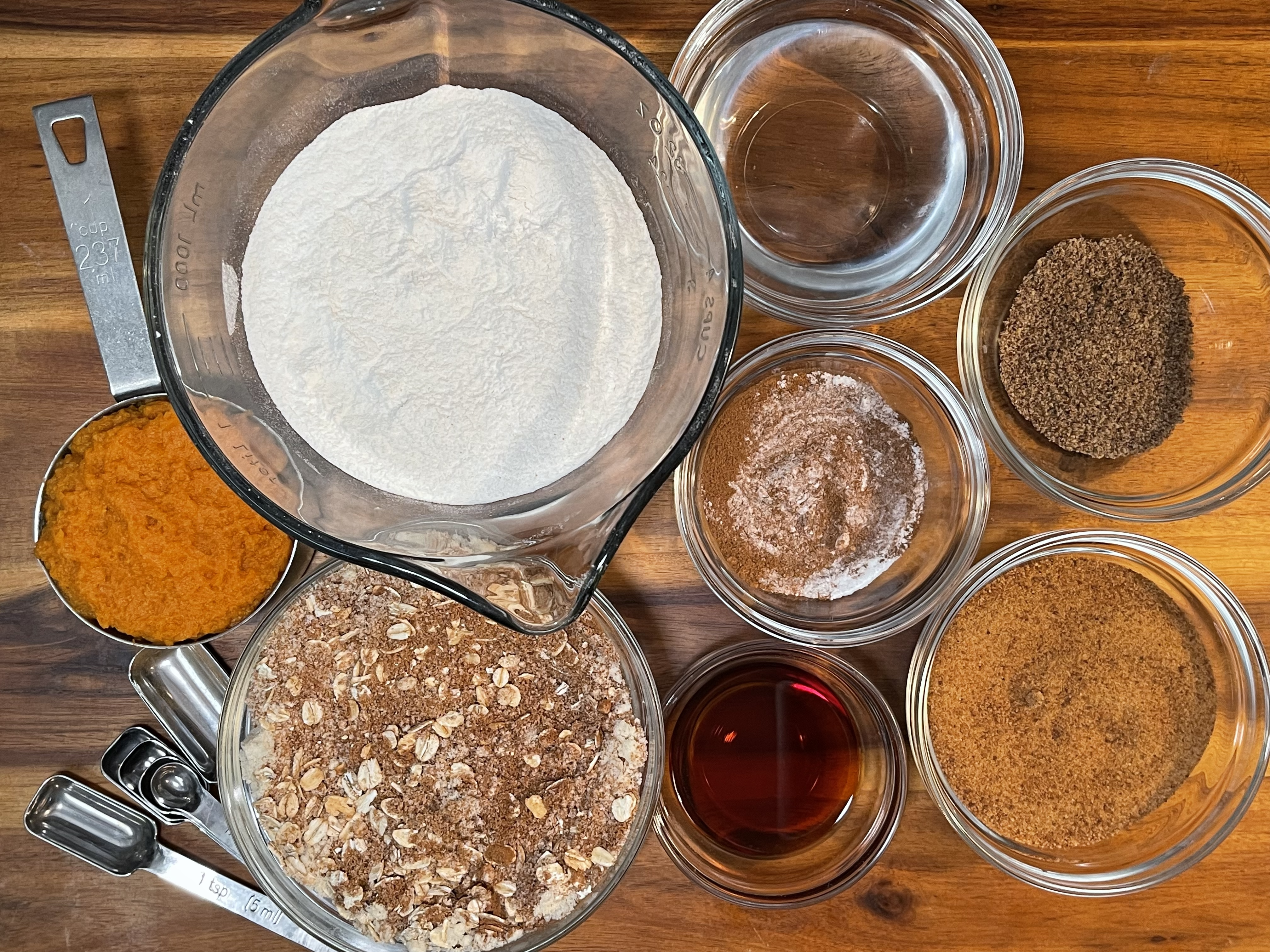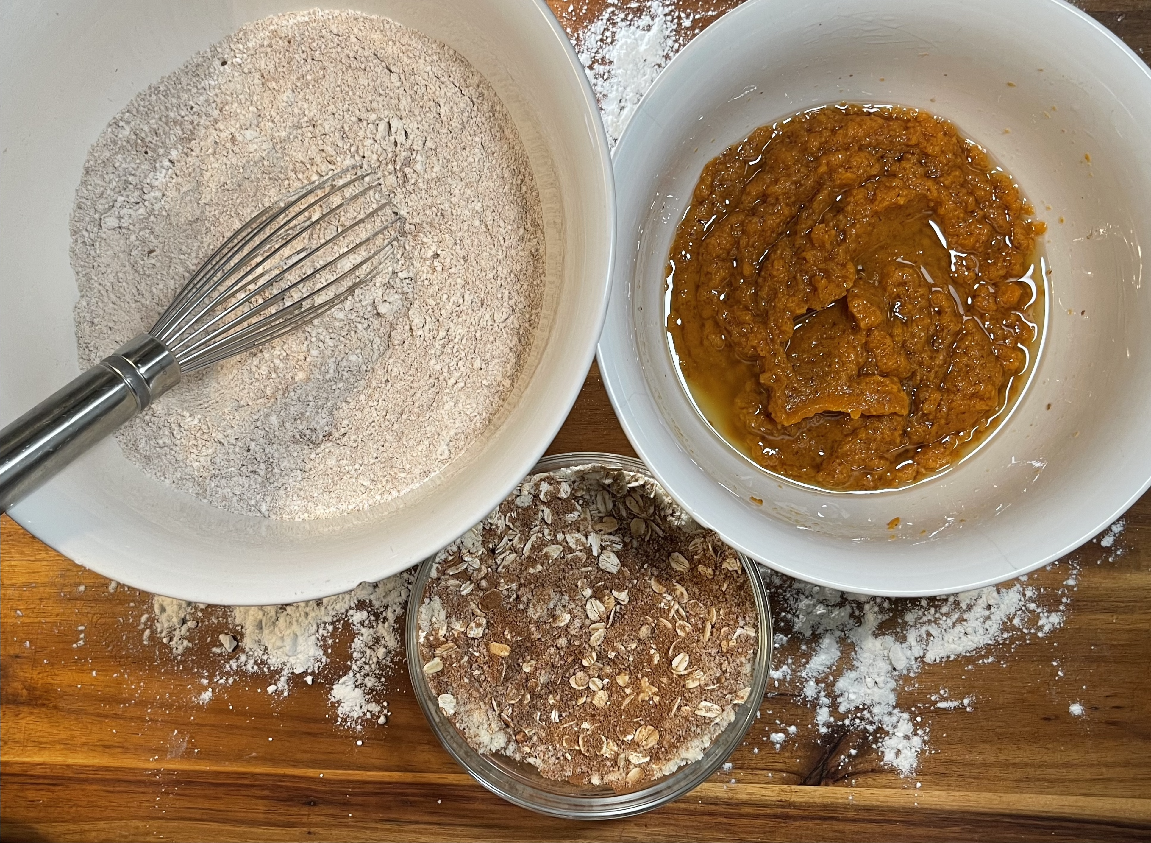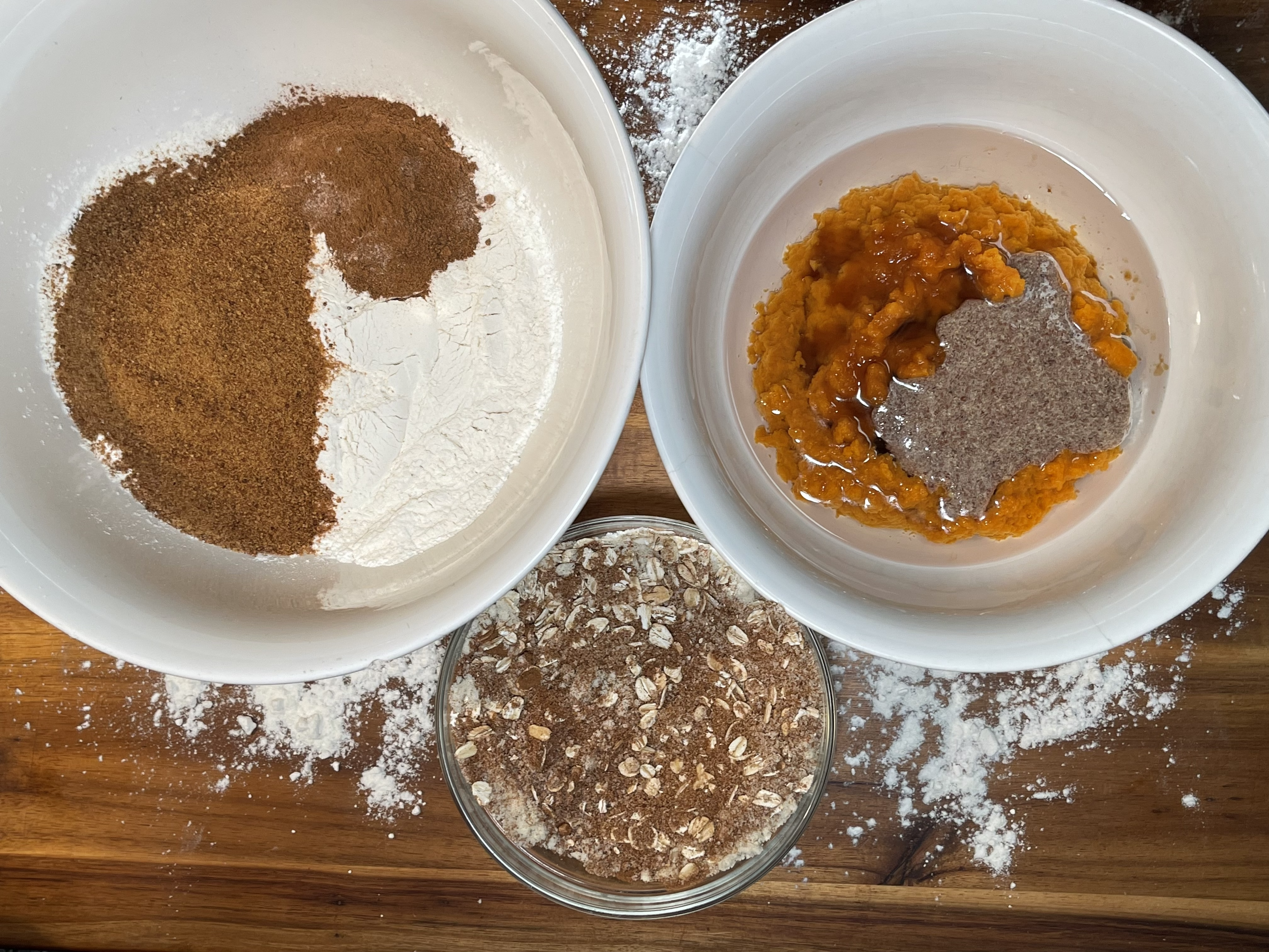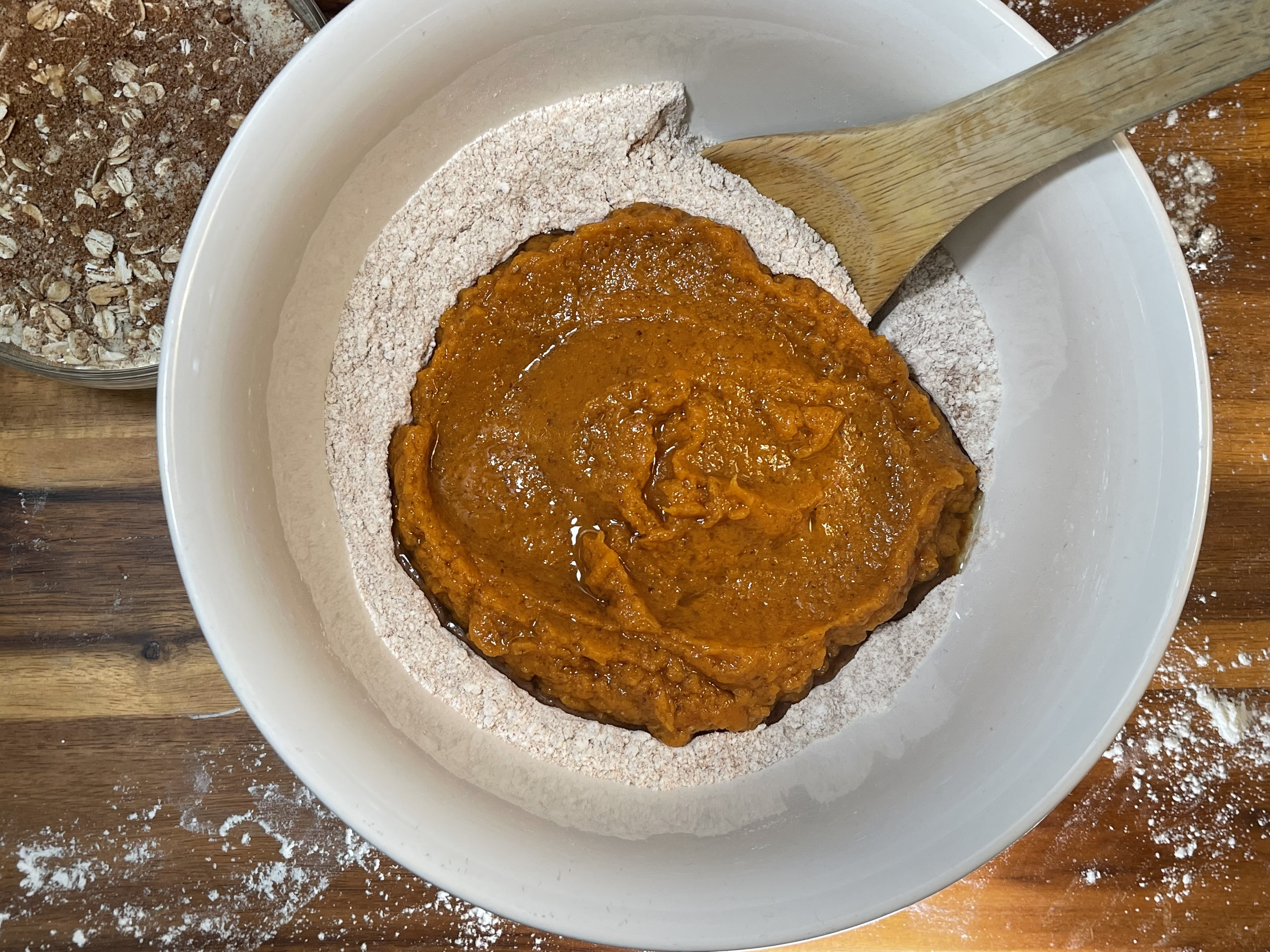- Mix your wet ingredients in a medium bowl. Start by melting your coconut oil. Add the pumpkin puree, maple syrup, and vanilla extract.